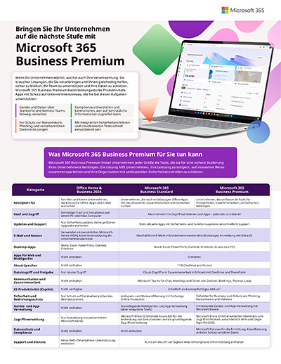 Wenn Ihr Unternehmen wächst, wächst auch Ihre Verantwortung. Sie brauchen Lösungen, die Sie voranbringen und Ihnen gleichzeitig helfen, sicher zu bleiben, Ihr Team zu unterstützen und Ihre Daten zu schützen. Microsoft 365 Business Premium bietet leistungsstarke Produktivitäts- Apps mit Schutz auf Unternehmensniveau, die Sie bei diesen Aufgaben unterstützen: