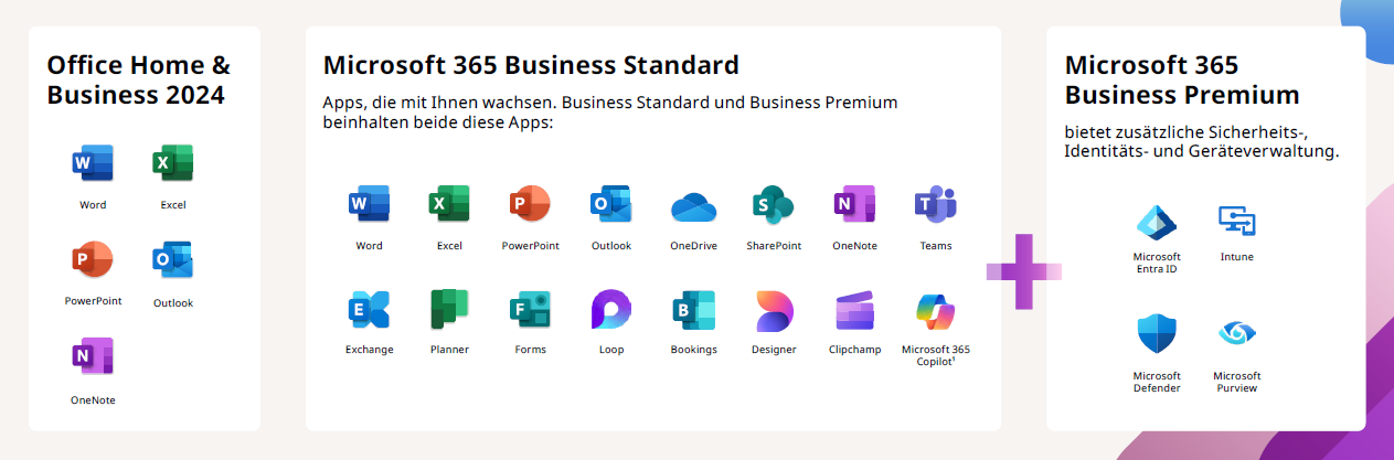 Microsoft 365 Business Premium bietet kleinen und mittleren Unternehmen eine klare Kombination aus vollständigen Office‑Apps, Cloud‑Zusammenarbeit und integrierter Sicherheitsplattform, die Standard‑ und Basic‑Pläne übertrifft: Es enthält die installierbaren Desktop‑Apps, Exchange‑Postfächer, 1 TB OneDrive‑Speicher sowie moderne Zusammenarbeitstools wie Teams und SharePoint, zugleich aber auch erweiterten Bedrohungs‑ und Endpunktschutz sowie Geräte‑ und Identitätsverwaltung, die in niedrigeren Business‑Plänen nicht vollständig oder in Produkten wie Office Home & Business 2024 gar nicht enthalten sind.